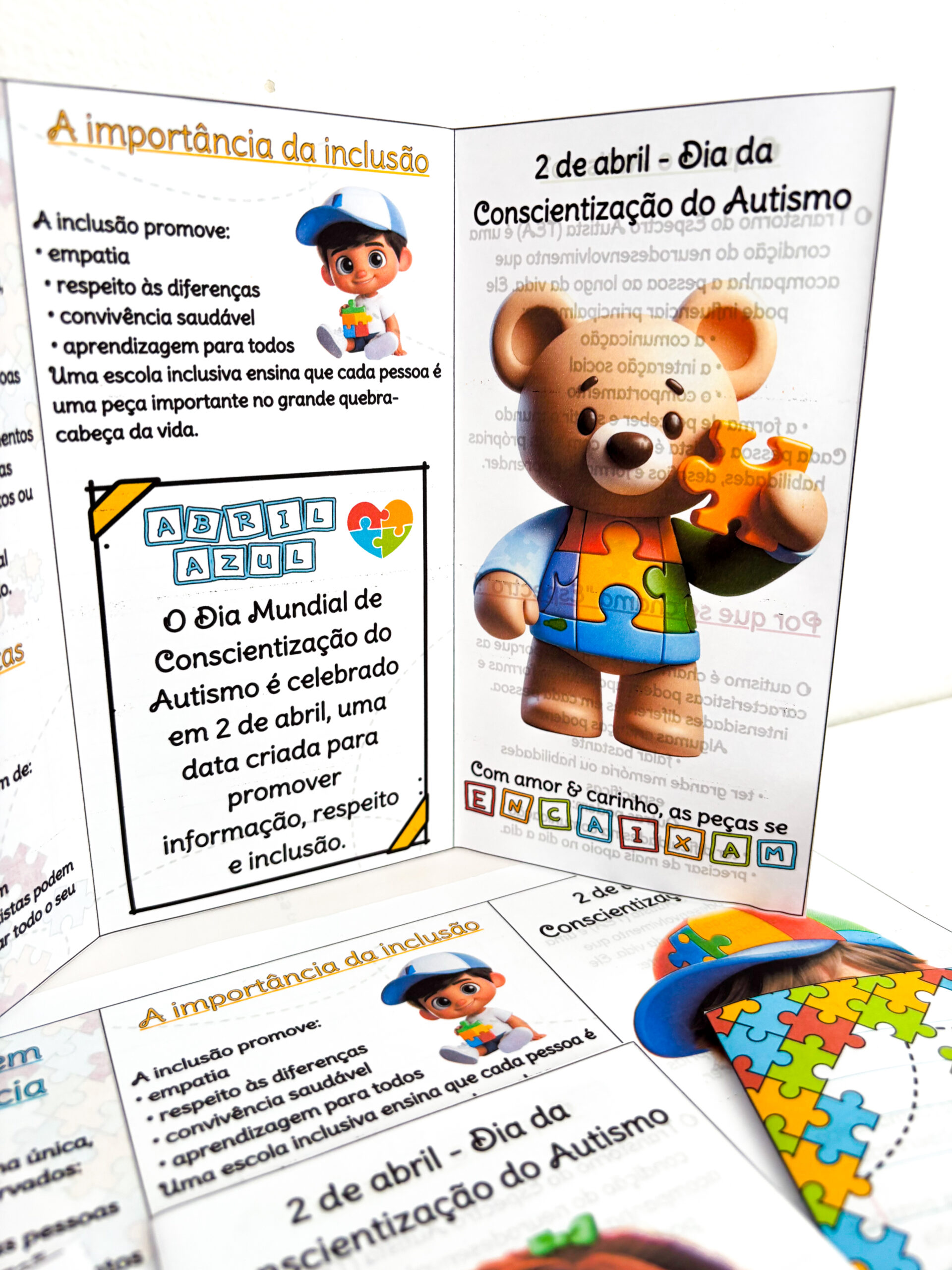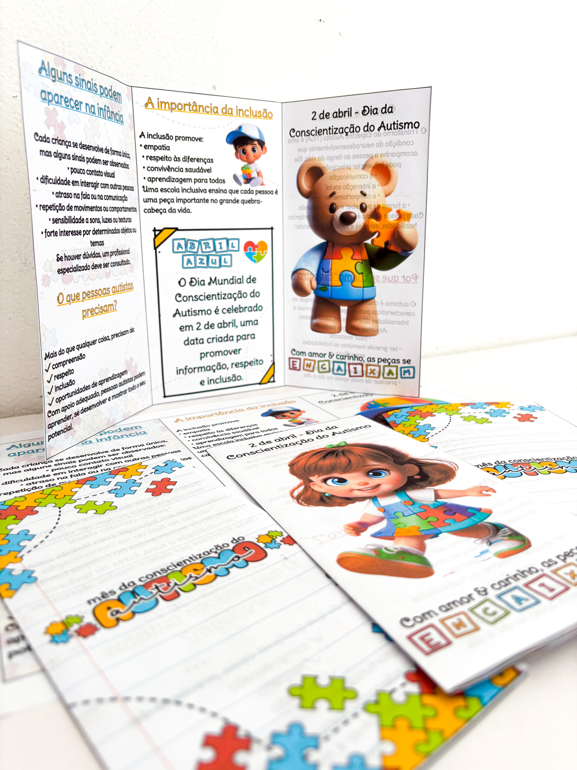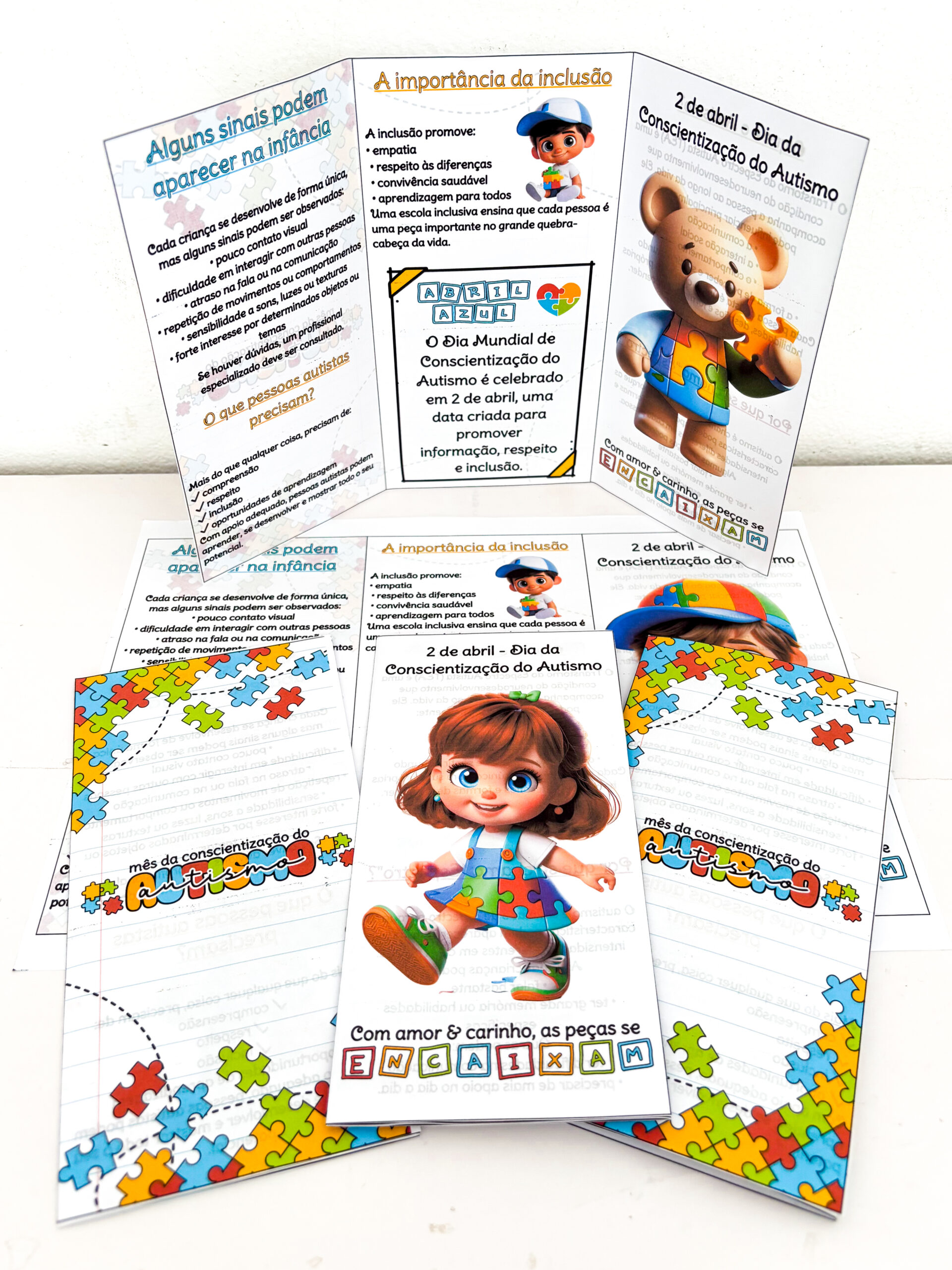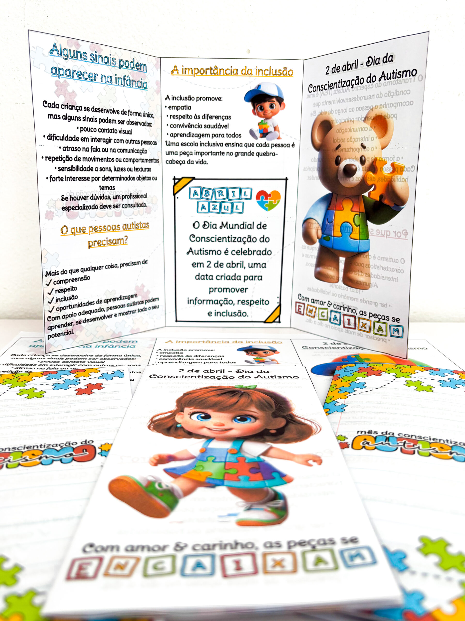 Pensando nisso, foram criados 3 modelos de folders, ideais para compartilhar com as famílias ou abordar o tema com a comunidade escolar. O material apresenta, de forma clara e acessível, sinais do autismo na infância, a importância da inclusão e o significado do dia 2 de abril.